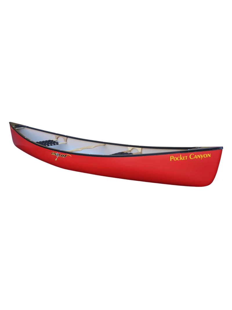 Canot Pocket Canyon d'Esquif : coque évasée stable, bouchin progressif, construction en T-Formex, parfait pour les descentes en eaux vives et les petites expéditions grâce à sa maniabilité exceptionnelle et son poids léger de 59 lb.